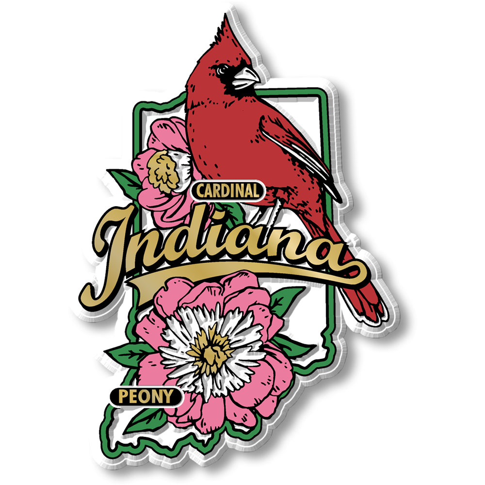 Our Indiana State Bird & Flower Map Magnets measure approximately 5 square inches and have a thickness of 0.1". The Indiana Classic State Bird & Flower Map Magnet design features a northern cardinal, peony flower, and a vintage type treatment, and is perfect for any refrigerator or metal surface. This Indiana magnet makes a great gift or souvenir! Like all of our refrigerator magnets, these are made of flexible molded rubber and are extremely durable and rich in color and detail. Plus, all of our Classic Magnets are 100% made in the USA.