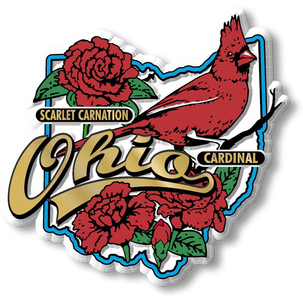 Our Ohio State Bird & Flower Map Magnets measure approximately 5 square inches and have a thickness of 0.1". The Ohio Classic State Bird & Flower Map Magnet design features a northern cardinal, scarlet carnation flower, and a vintage type treatment, and is perfect for any refrigerator or metal surface. This Ohio magnet makes a great gift or souvenir! Like all of our refrigerator magnets, these are made of flexible molded rubber and are extremely durable and rich in color and detail. Plus, all of our Classic Magnets are 100% made in the USA.