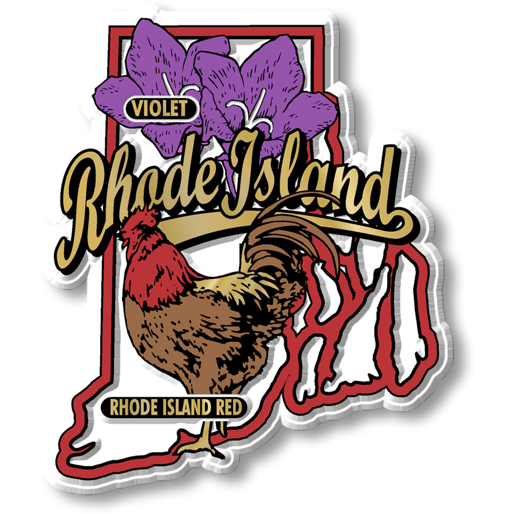 Our Rhode Island State Bird & Flower Map Magnets measure approximately 5 square inches and have a thickness of 0.1". The Rhode Island State Bird & Flower Map Magnet design features a Rhode Island Red rooster, Violet flower, and a vintage type treatment, and is perfect for any refrigerator or metal surface. This Rhode Island magnet makes a great gift or souvenir! Like all of our refrigerator magnets, these are made of flexible molded rubber and are extremely durable and rich in color and detail. Plus, all of our Classic Magnets are 100% made in the USA.