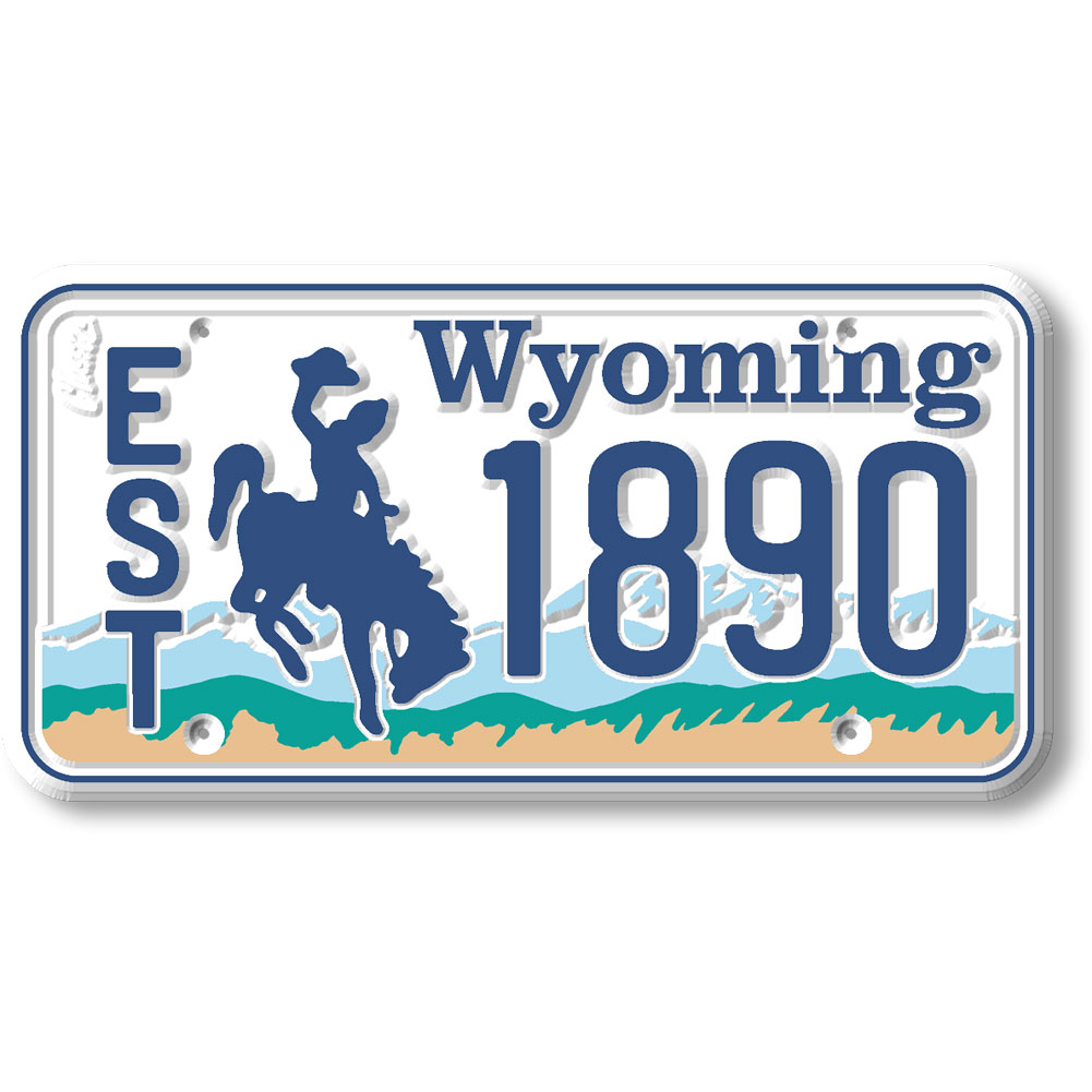 - Design: Embossed license plate design with bucking horse symbol and year of statehood.